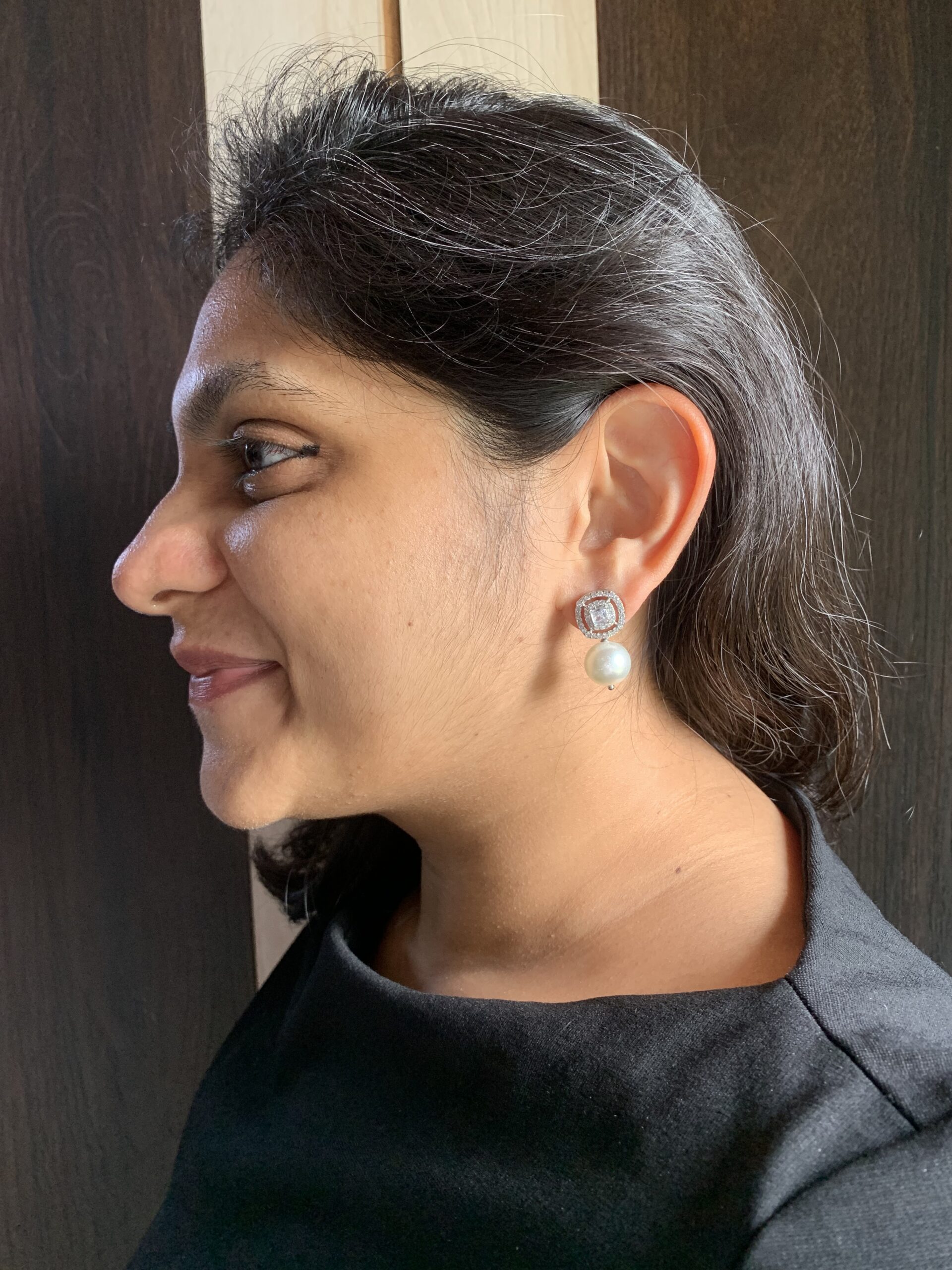 Cushion Center with Round Two Lines Pearl Drop Earrings